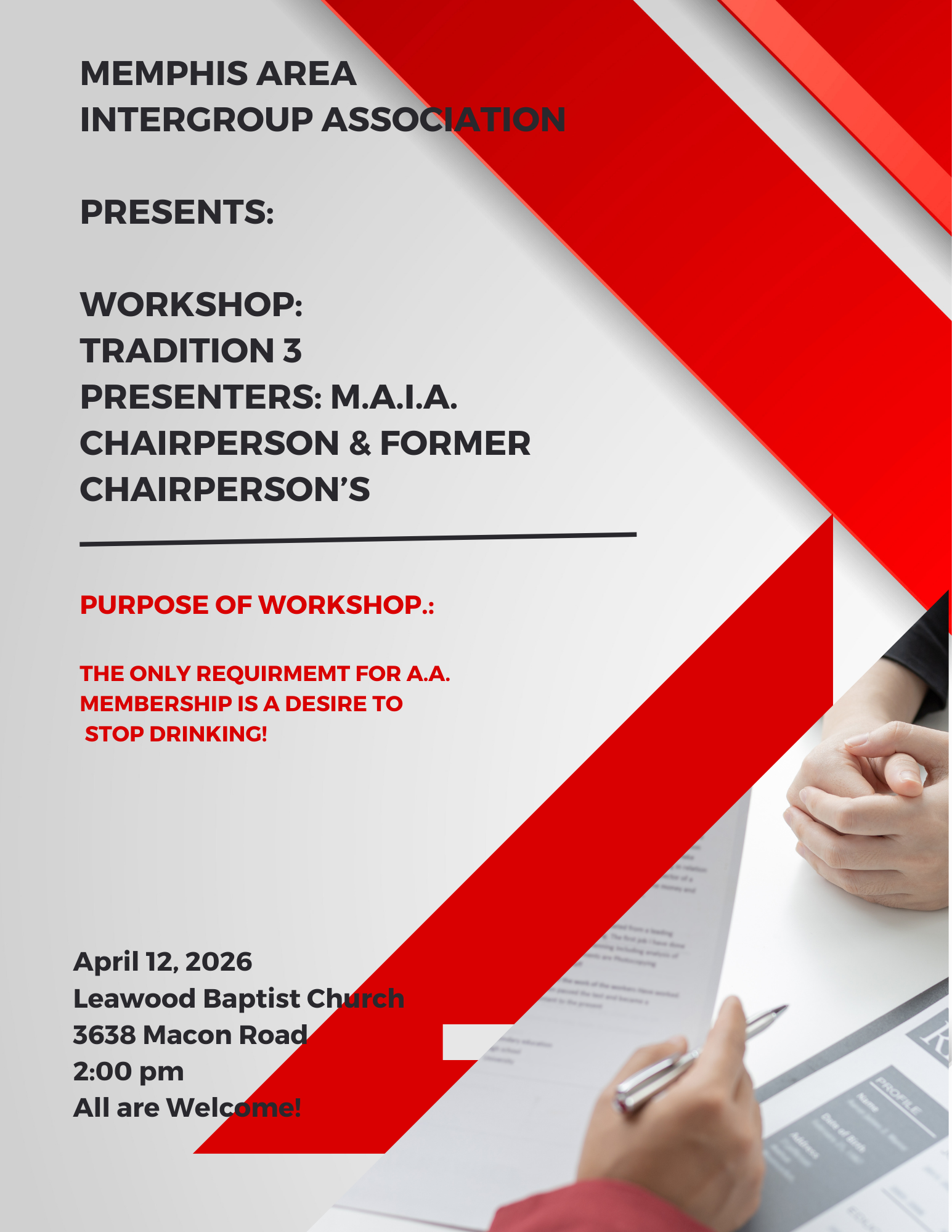 A.A. Related Flyers Flyer Disclaimer So, what does your Intergroup Do M.A.I.A. Annual Workshop District 25 2026 Workshop Save the Date-29th Annual TN Area 52 Al-Anon Convention 86th Annual Old Grandad 2026